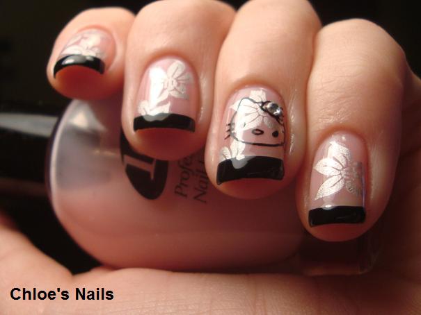 Now on to stamping. I used the flower image on the plate first, and used China Glaze Millenium for them. Then I used the cute Hello Kitty image, and Konad polish in black for that :)
