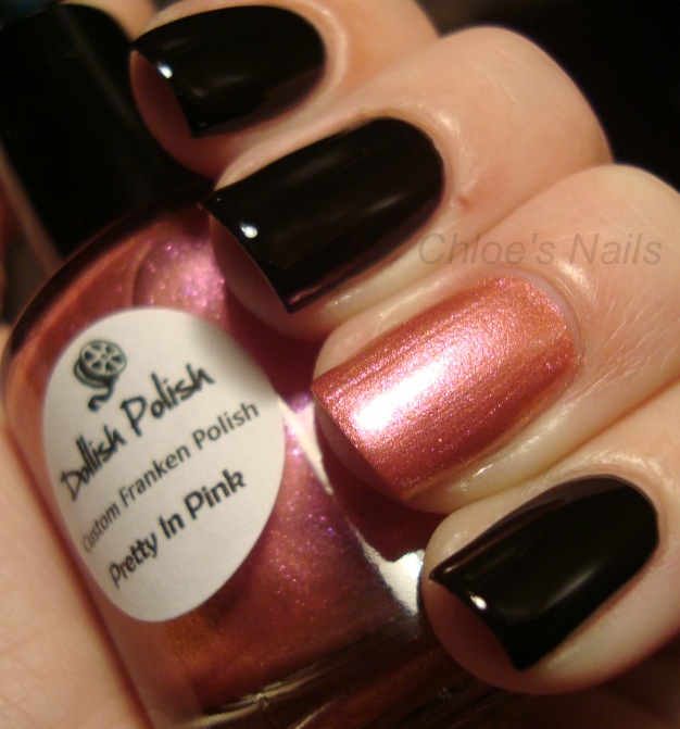 I started with using Sinful Black on Black on all my nails except my ring finger nails. On them I used a polish I purchased from Etsy called Pretty in Pink, it's a pink and orange duochrome. The seller is DollishPolish. I love her stuff and have a few others to share with you guys :)